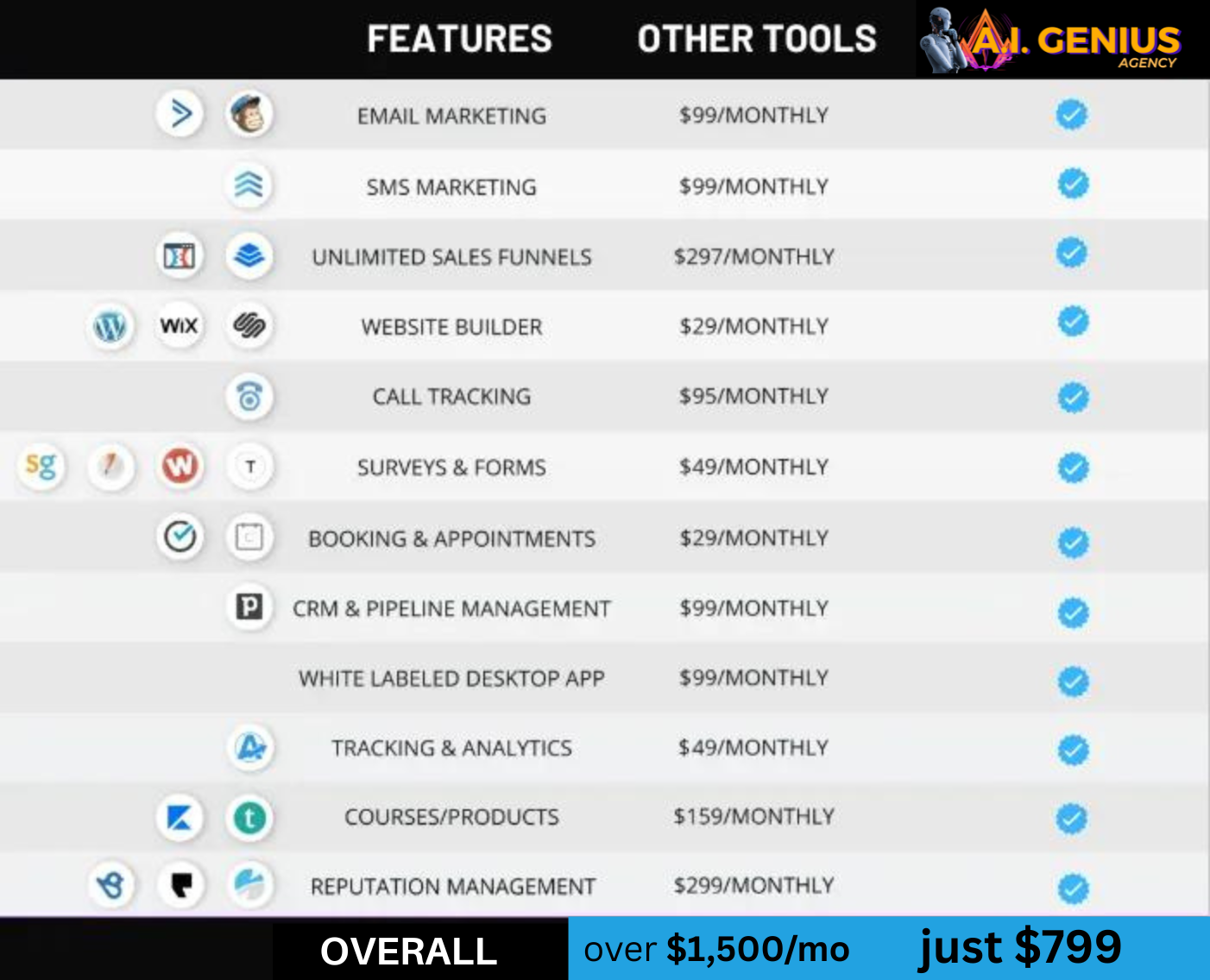 The AI Genius Marketing Suite simplifies your business by replacing multiple complex software tools for marketing, selling, hosting, lead generation, lead nurture, automation, and reputation management.